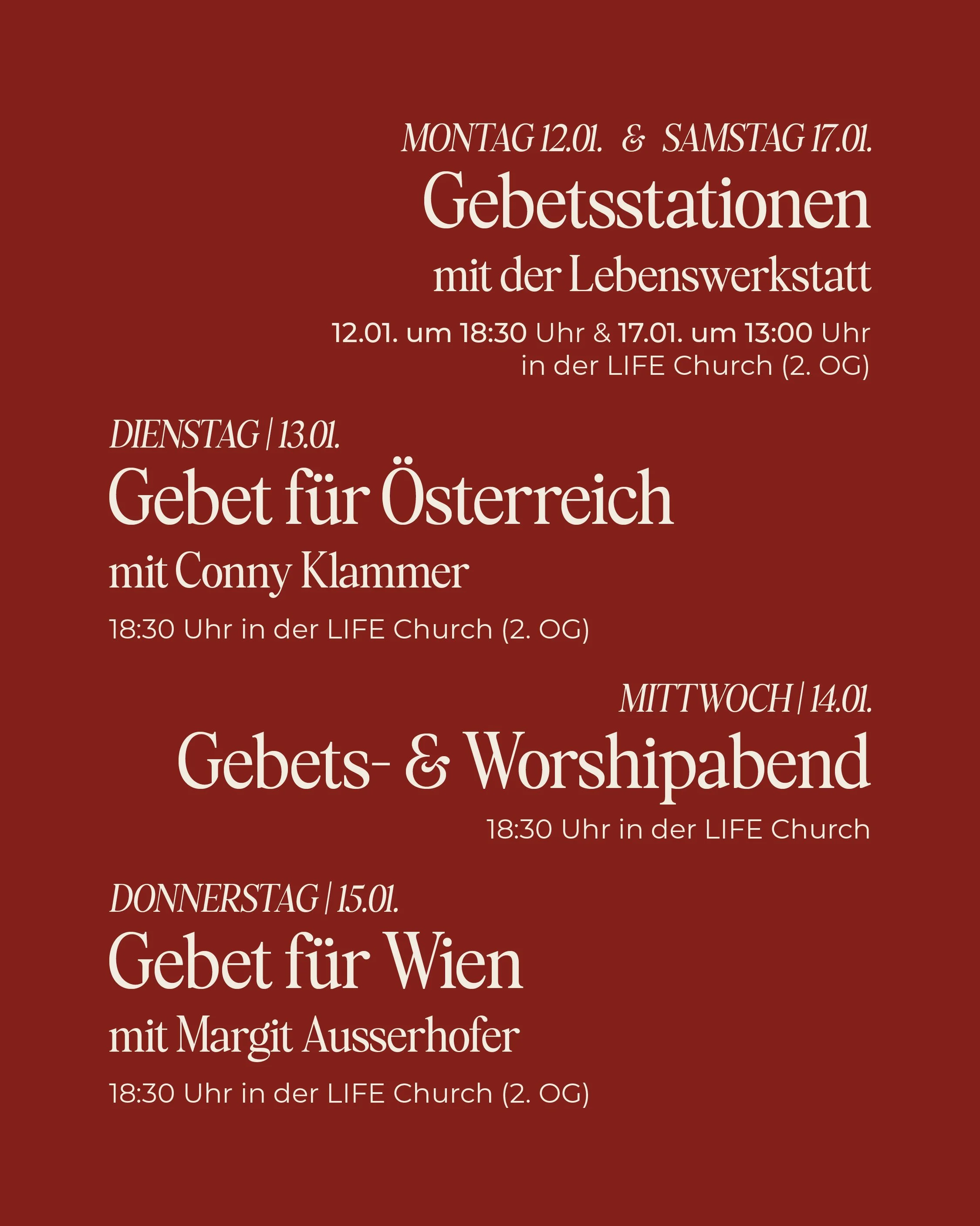 Wir starten das Jahr mit Gebet und wollen uns bewusst Zeit dafür nehmen. Neben den persönlichen Gebetszeiten, bist du eingeladen an unterschiedlichen Gebetsterminen vor Ort oder online teilzunehmen.